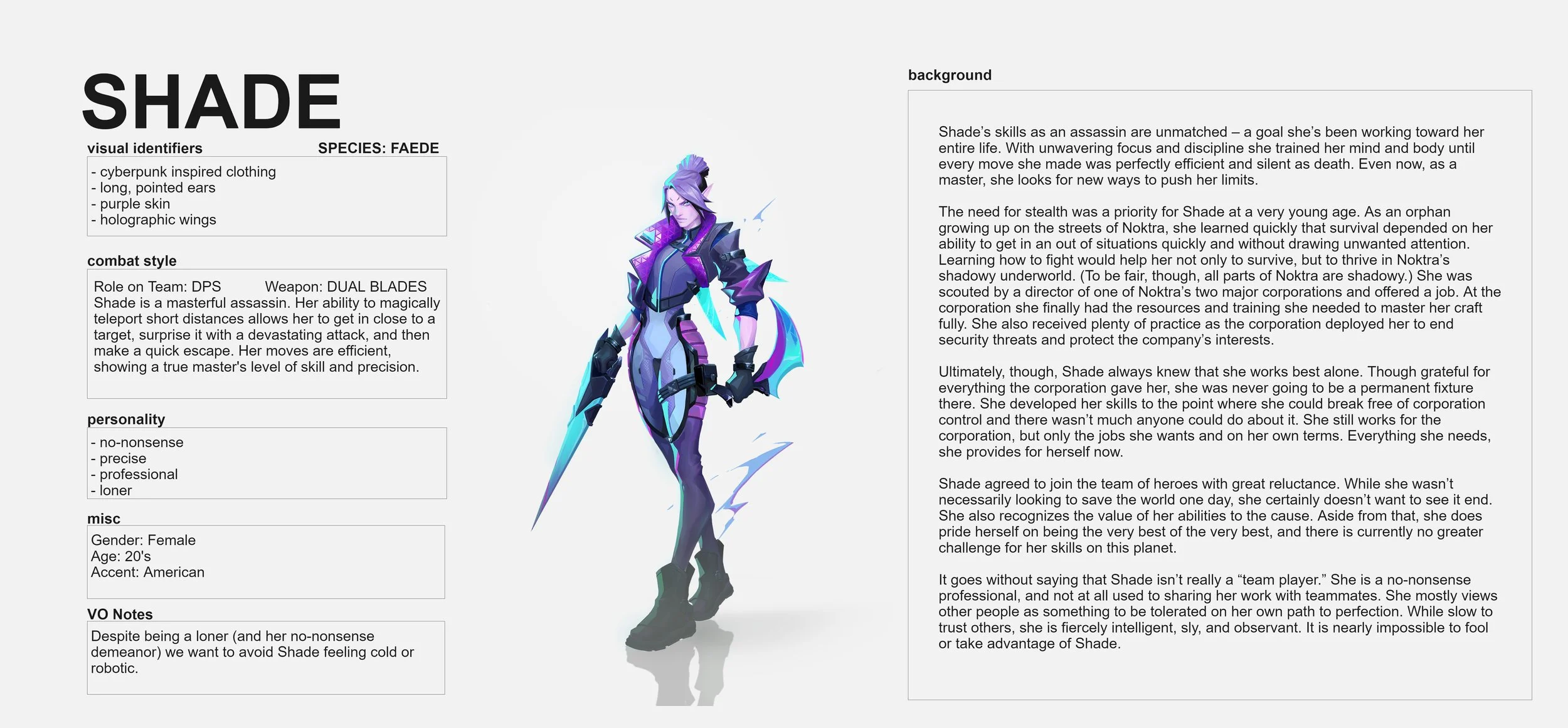 Character sheets for 20 playable heroes, providing narrative background and notes for voice actors.