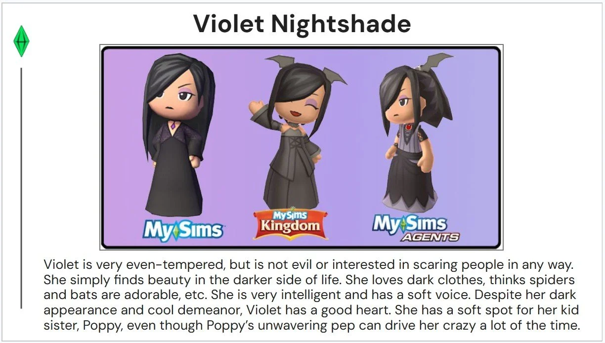 A reference guide for 50 of the most popular MySims characters (and Guillermo the pigeon) prepared for Maxis and our external partners.